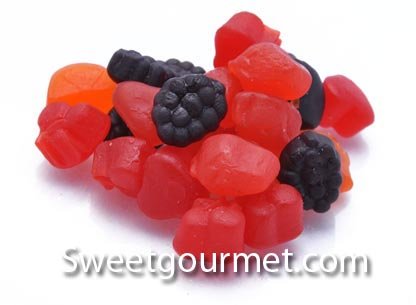 ingredients: fruit juice concentrate(apple, white grape), sugar, corn syrup, unmodified and modified corn starch, hydrogenated coconut oil, camauba wax, artificial color (red 40, yellow 6, blue 1, red 3), beeswax.