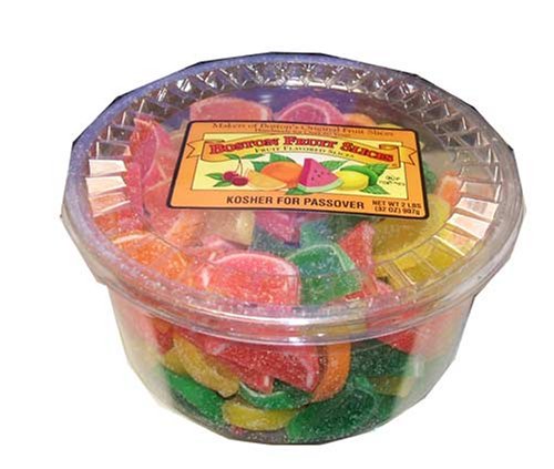 Boston Fruit Slices. Each tub contains 2 pounds (approximately 147 pieces) of assorted flavored fruit slices. Delicious and kosher for Passover.