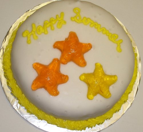 - Chocolate Chip Decorated Cake Single Layer 8" RoundTopped with Tropical Punch Orange Starfish Gummies+Free Shipping!
