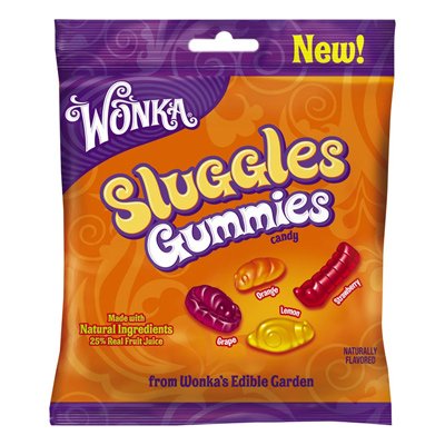 Sluggles Gummies Peg Bag: 12 Count From the Willy Wonka Factory comes an assortment of fruity chewy gummi garden bugs!! There are four different flavors: orange grape lemon and strawberry. Each bag is approximately 6.5oz. FLAVOR: Assorted